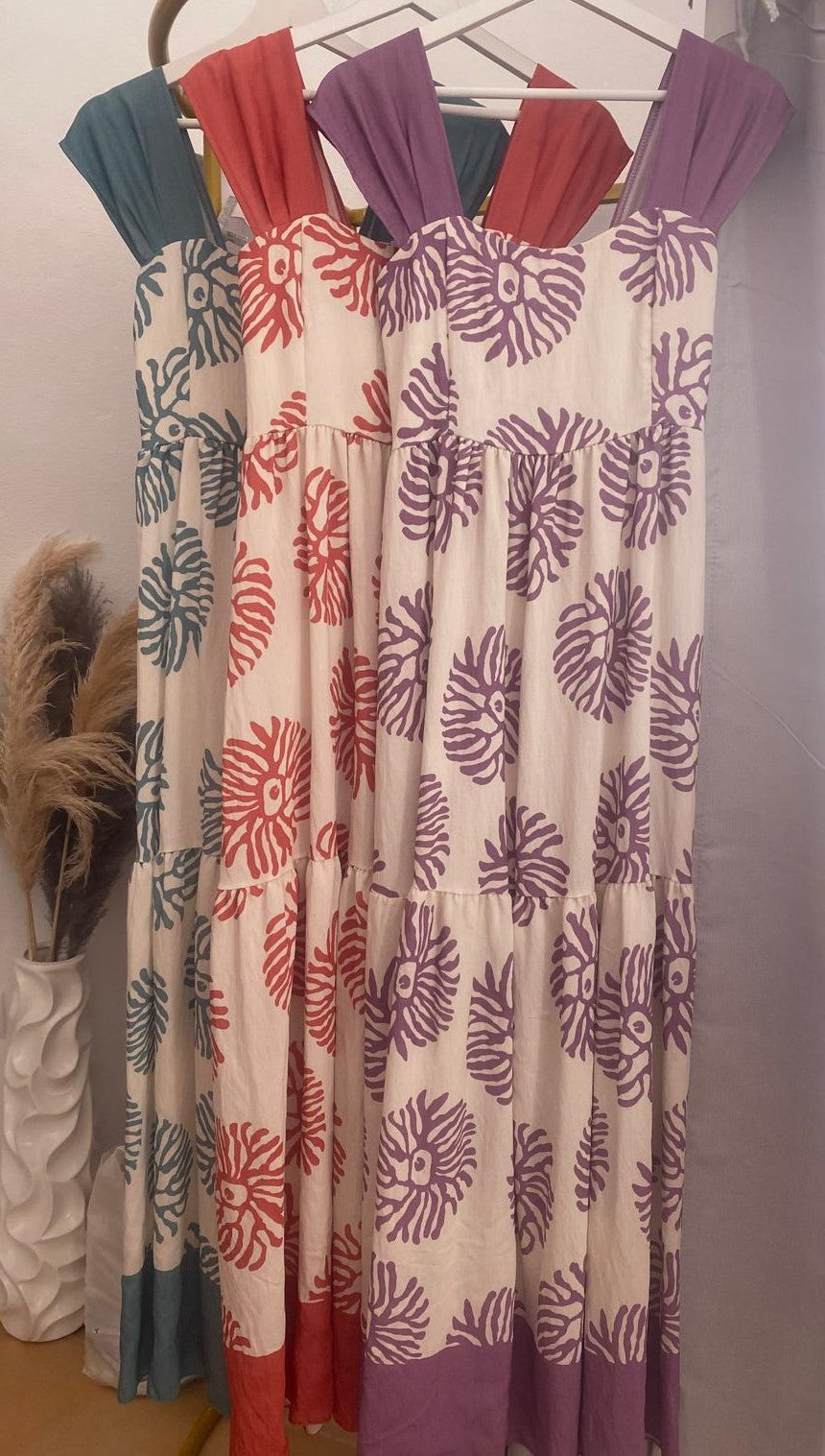 Vestido largo de volante con estampado de algas.