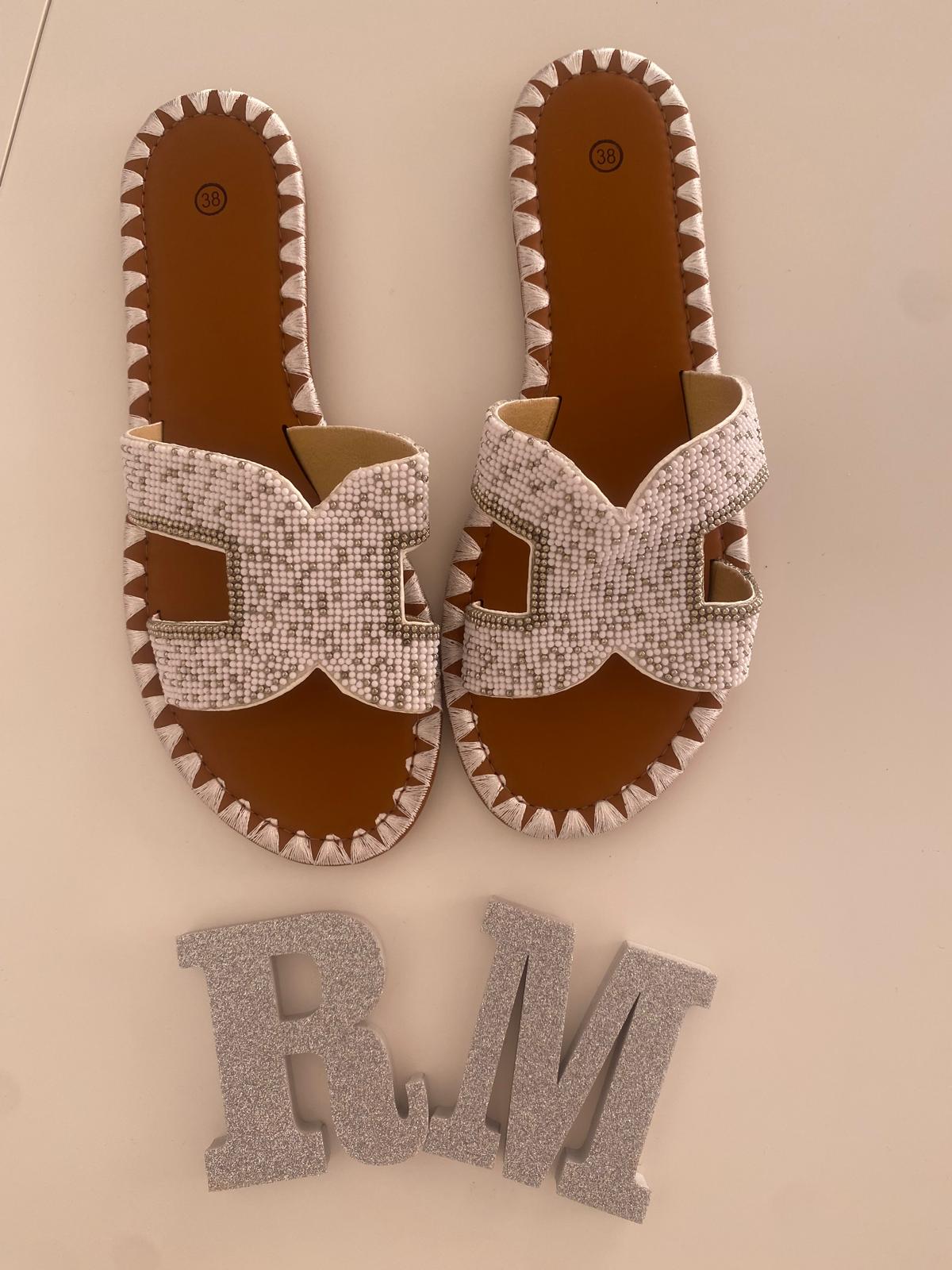 Sandalia plana con perlas y plantilla efecto cuero.